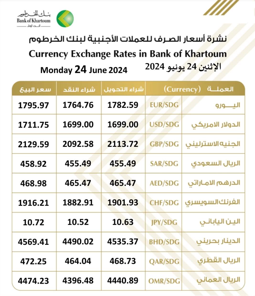 اسعار العملات الأجنبية في بنك الخرطوم اليوم الإثنين 24 يونيو 2024م أسعار العملاتاقتصاد بواسطة الاحداث نيوز في يونيو 24, 2024 591 بنك الخرطوم المزيد من المشاركات تحسن ملحوظ للجنيه السوداني مقابل الجنيه المصري فبراير 13, 2026 بنك السودان المركزي يصدر قراراً مفاجئاً تجاه بنك… فبراير 13, 2026 اسعار العملات الأجنبية في بنك الخرطوم اليوم الإثنين 24 يونيو 2024م أسعار الصرف في السودانالدولارالسودانبنك الخرطوم 591 شارك