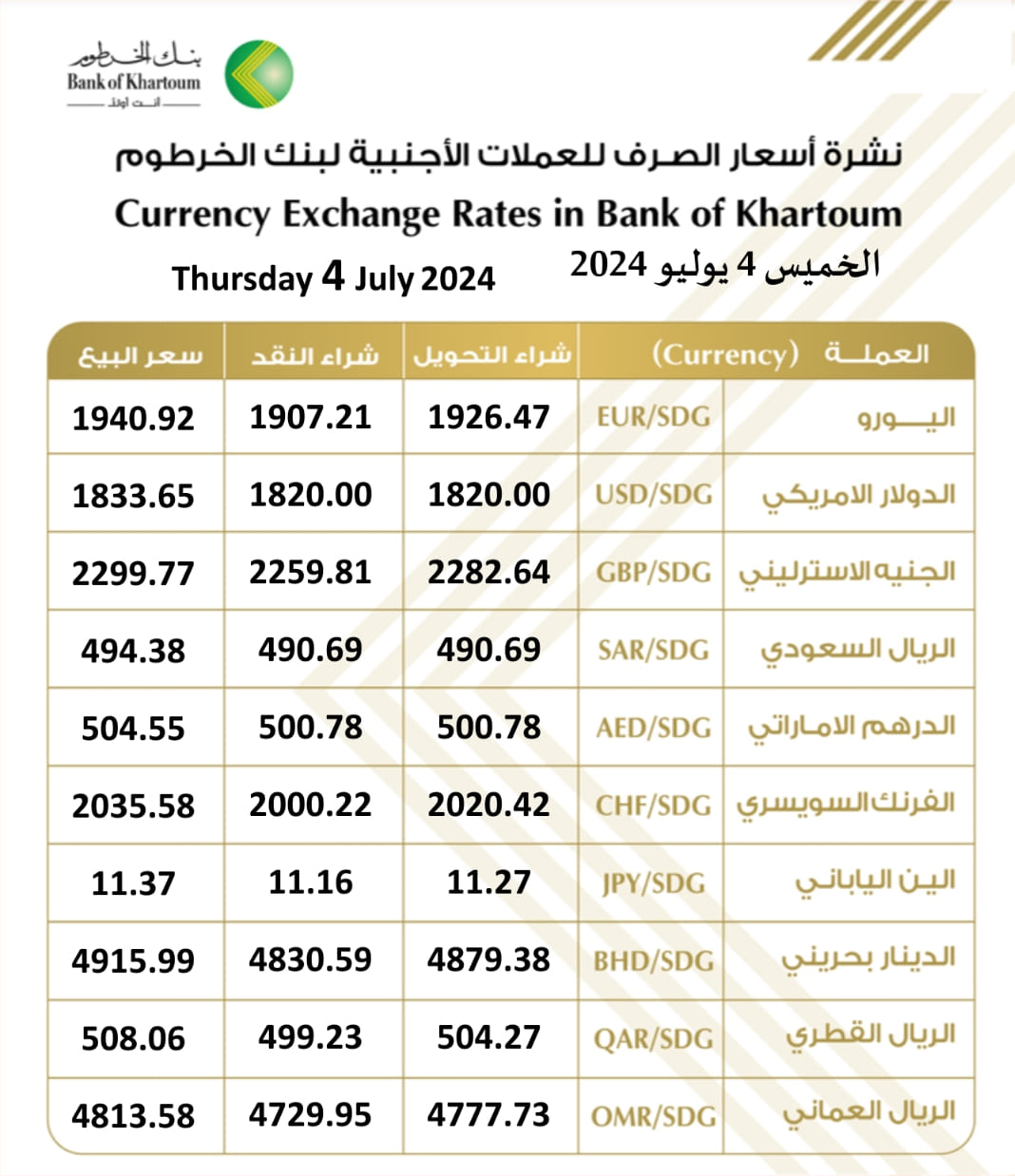 ونشر بنك الخرطوم اسعار العملات اليوم الخميس 4 يوليو 20024م على النحو التالي :