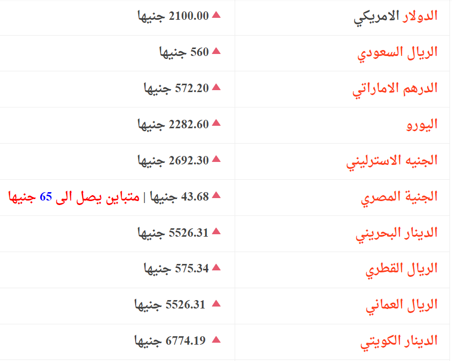 حيث بلغ الدولار 21000 جنيه للشراء مقابل 2150 جنيه للبيع، بينما سجل الريال السعودي 560 جنيه للشراء مقابل 573.33 حنيه للبيع.