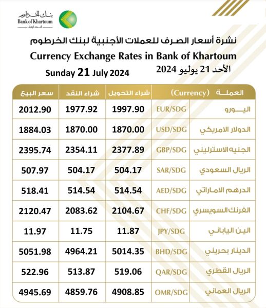 اعلن بنك الخرطوم اليوم الاحد اسعار العملات الاجنبية مقابل الجنيه السوداني ويشهد الجنيه السوداني تدهور تاريخي بسبب الحرب الدائرة في السودان مما تسببت في توقف عجلة الانتاج