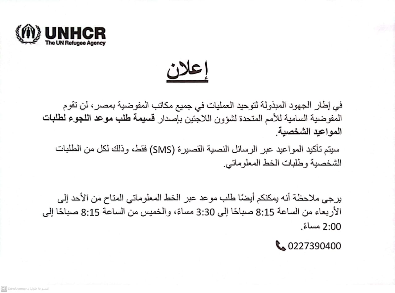 أصدرت مفوضية اللاجئين في مصر، إعلانا مهما لطالبي اللجوء، وقالت إنه في إطار الجهود المبذولة لتوحيد العمليات في جميع مكاتب المفوضية بمصر، لن تقوم المفوضية السامية للأمم المتحدة لشؤون اللاجئين بإصدار قسيمة طلب موعد اللجوء لطلبات المواعيد الشخصية.