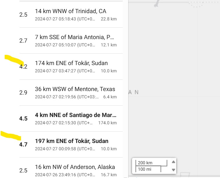 ذكر الموقع وقوع هزتين الاولى بقوة 4.7 درجة على مقياس ريختر والثانية بقوة 4.2 درجة على مقياس ريختر عند الساعة 2:47 يتوقيت الخرطوم 3:47 بتوقيت مكة.