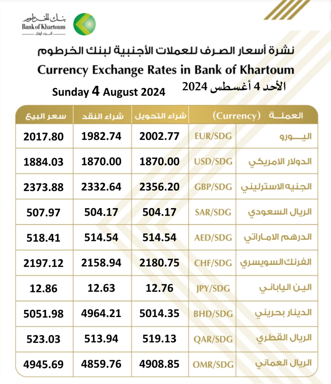 اعلن بنك الخرطوم اسعار العملات الاجنبية مقابل الجنيه السوداني اليوم الأحد 4 أغسطس