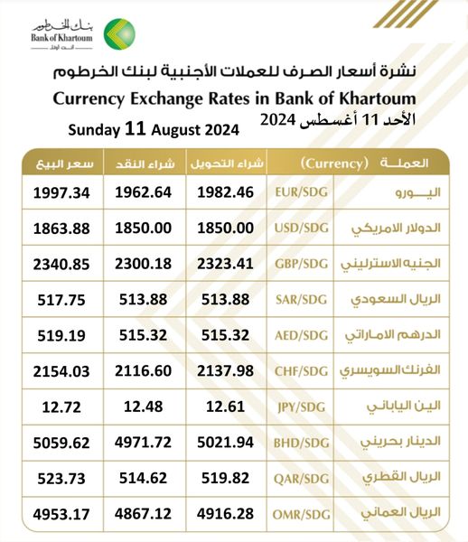 نشر بنك الخرطوم اسعار العملات الاجنبية مقابل الجنيه السوداني اليوم الأحد 11 أغسطس 2024م ونشهد العملات استقرار نسبي في بنك الخرطوم .