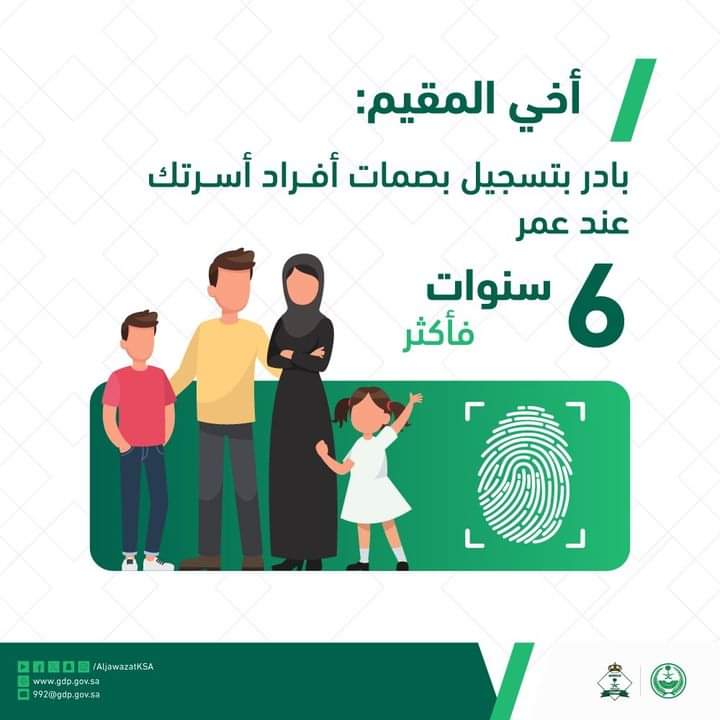 وجهت الجوازات السعودية المقيمين في المملكة بالاسراع في تسجيل بصمات أفراد الأسرة عند بلوغهم عمر 6 سنوات .