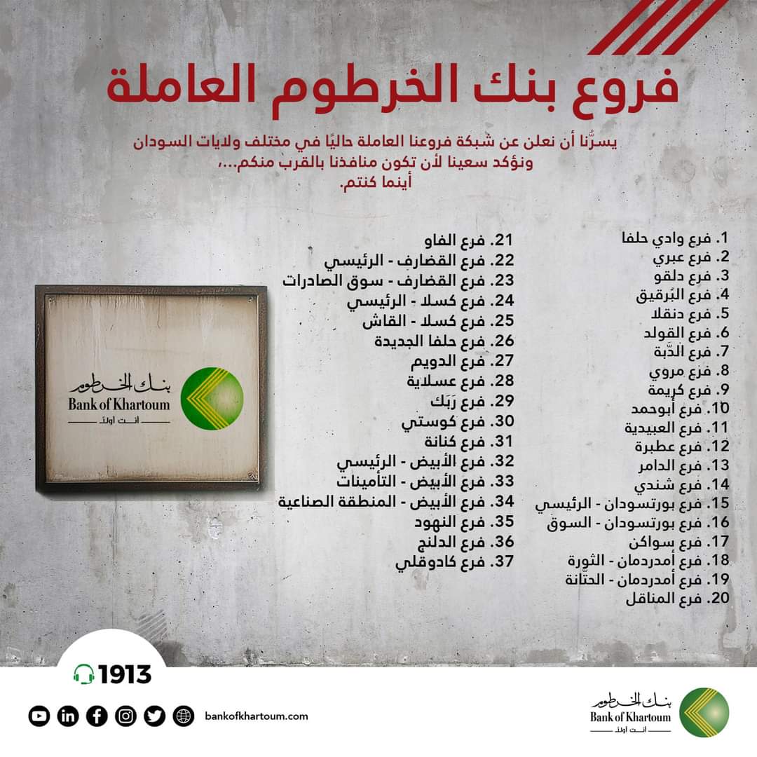 وقال: أعزائنا الأكارم، إليكم شبكة فروعنا العاملة حاليًا، في مختلف ولايات السودان ونؤكد سعينا لأن تكون منافذنا بالقرب منكم، أينما كنتم”.
