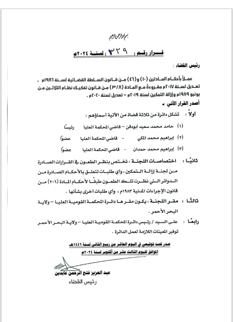 متابعات – الاحداث نيوز – أصدر رئيس القضاء في السودان، عبد العزيز فتح الرحمن عابدين، قرارًا بتشكيل لجنة تختص بنظر الطعون في القرارات الصادرة من لجنة إزالة التمكين، وأي طلبات تتعلق بالأحكام الصادرة من الدوائر التي نظرت تلك الطعون طبقا لأحكام المادة (206) من قانون الإجراءات المدنية 1983م، وأي طلبات أخرى بشأنها.