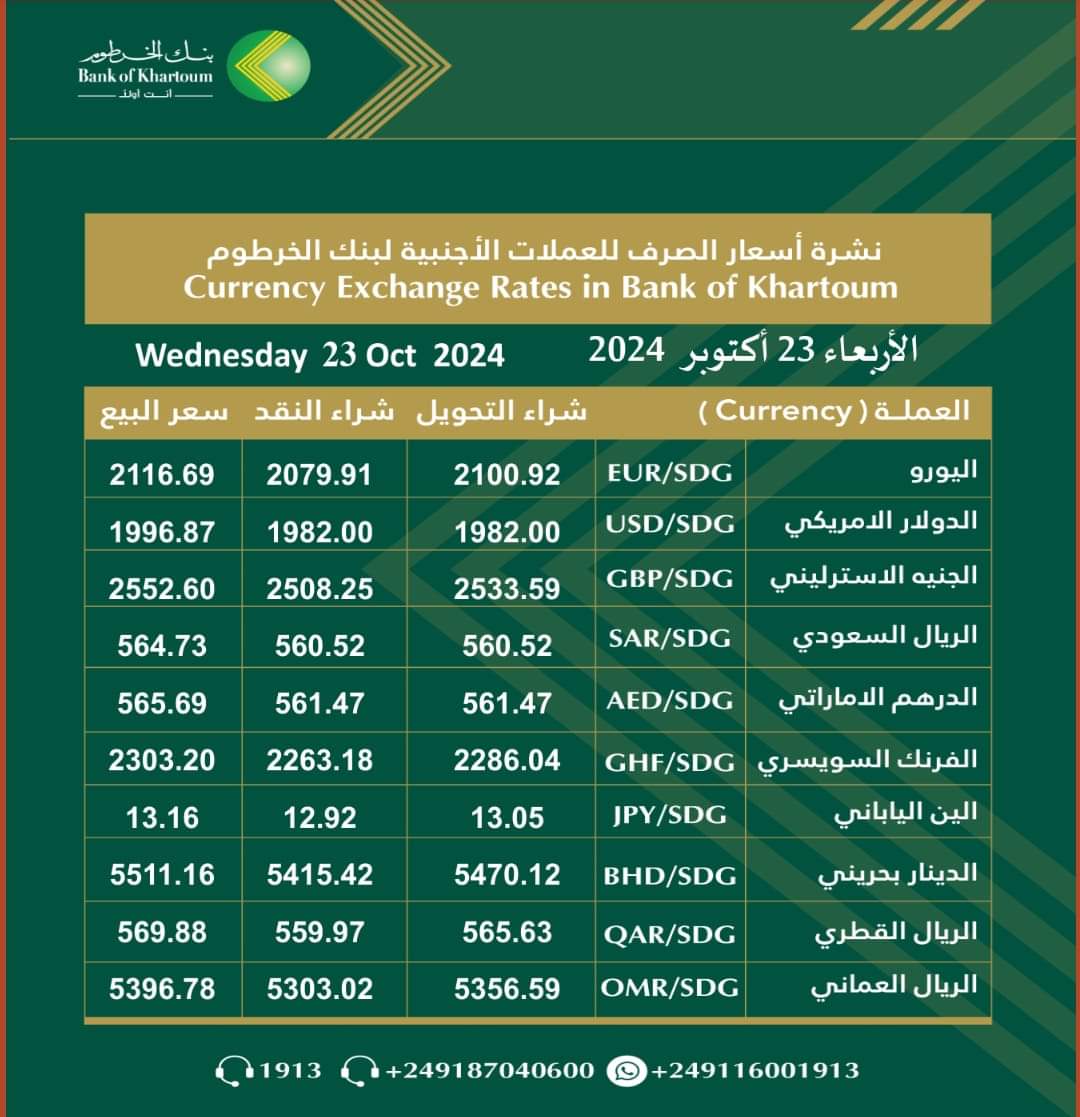 بنك الخرطوم يعلن اسعار العملات الاجنبية مقابل الجنيه السوداني اليوم الاربعاء 23 اكتوبر
