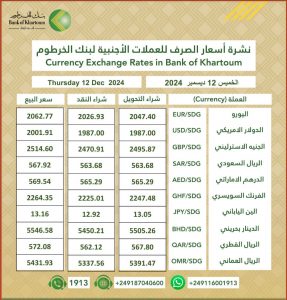 اسعار الصرف للعملات الاجنبية في بنك الخرطوم ليوم الخميس الموافق 12 ديسمبر2024م