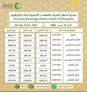 سعر الصرف للعملات الاجنبية في بنك الخرطوم ليوم الأثنين الموافق 16 ديسمبر2024م