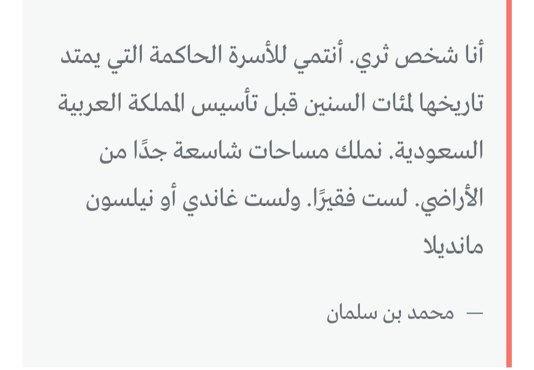 في مقابلة مع برنامج 60 دقيقة على سي بي إس نيوز الأمريكية، اعتبر ولي العهد السعودي، محمد بن سلمان، أن موارده المالية «مسألة خاصة»، وأنه لا يحتاج إلى الاعتذار عن أسلوب حياته المترف.وقال ابن سلمان، إن جزءًا كبيرًا من ثروته يذهب إلى الأعمال الخيرية: «أنفق 51% على الأقل على الناس و49% على نفسي».
