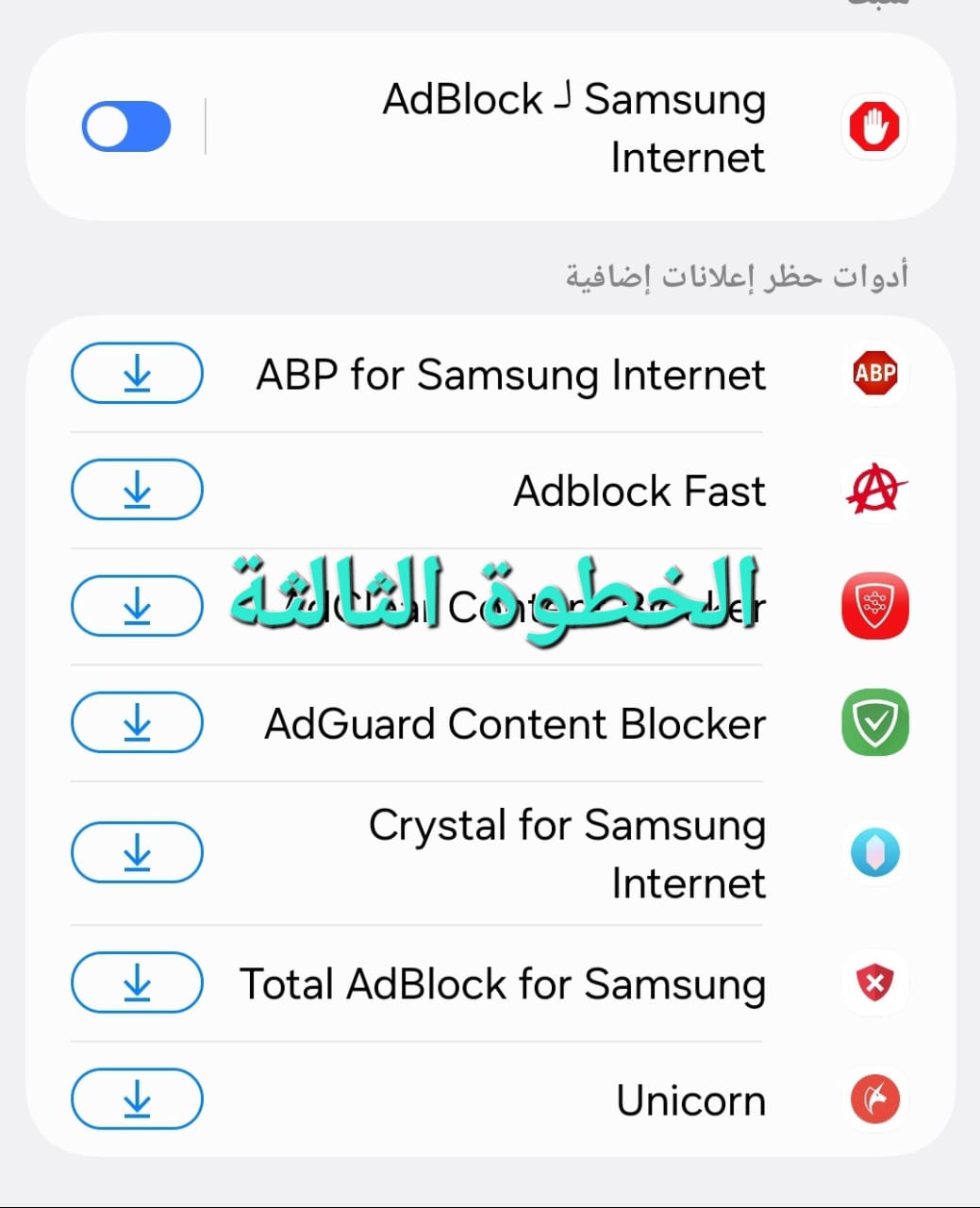 3. الخطوة الثالثة: إذا كنت من مستخدمي هواتف سامسونج، اضغط على الخيار المخصص لمنع الإعلانات. أما إذا كان هاتفك غير سامسونج، فقم بتنزيل أحد التطبيقات المشار إليها في الصورة.