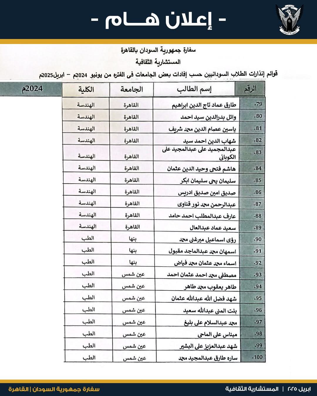 نود إحاطتكم علماً بأن الطلاب المذكورين أدناه قد تحصل كل منهم على إنذار من الجامعة الموضحة أمامه، عليه نرجو من أولياء أمور الطلاب مراجعة الكليات في الجامعات الموضحة وذلك لمتابعة الوضع الأكاديمي لأبنائهم حفاظاً على استمراريتهم في الدراسة وتأمين الموقف الأكاديمي.