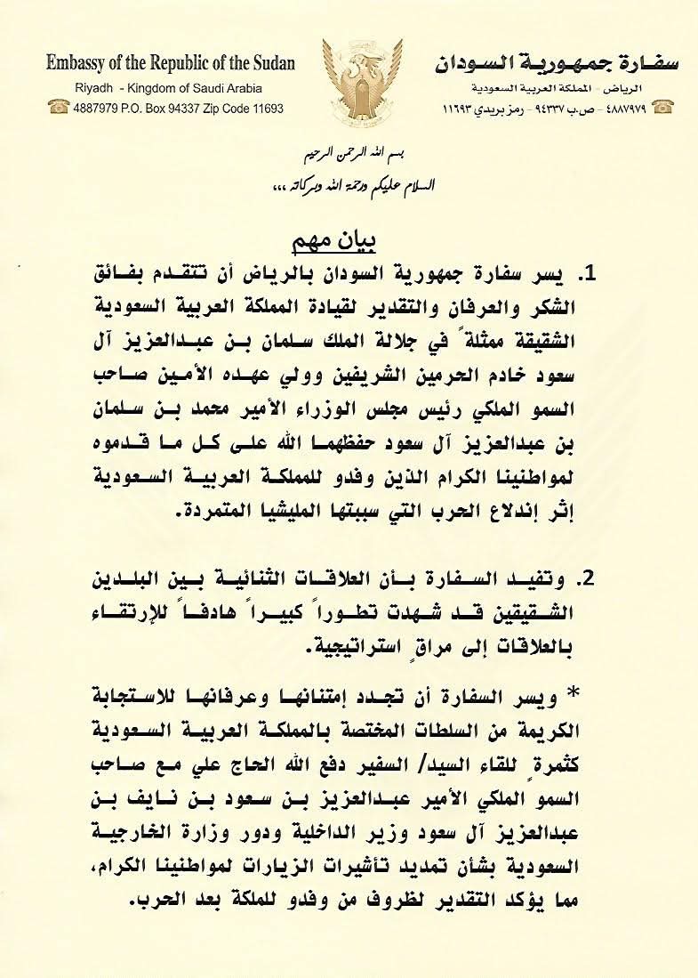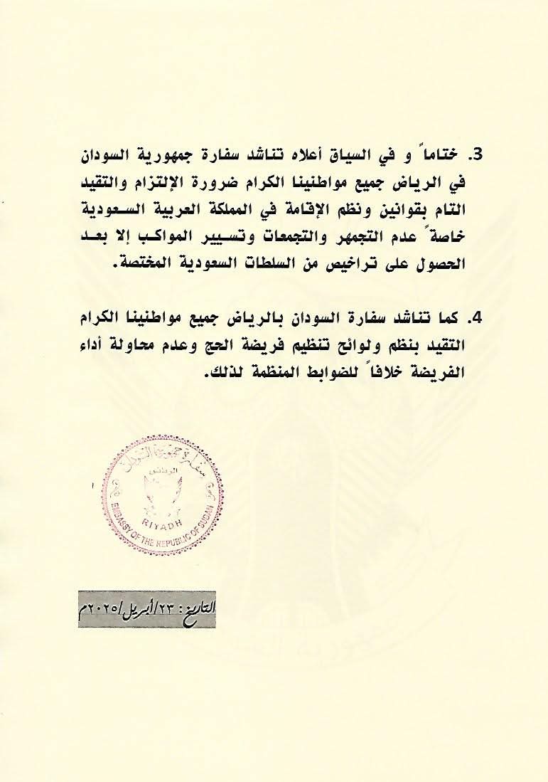 في خطوة جاءت استجابة لمطالب السفارة السودانية في الرياض، وافقت السلطات السعودية رسميًا على تمديد فترة السماح للسودانيين المقيمين بتأشيرات زيارة لمدة ثلاثة أشهر إضافية، بعد طلب تقدمت به السفارة لتخفيف الأعباء عن السودانيين المتأثرين بالأوضاع في بلادهم.