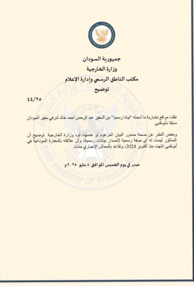 تناقلت العديد من الحسابات في مواقع التواصل الاجتماعي خبراً مفاده أن سفير السودان بدولة الإمارات، السيد عبدالرحمن شرفي، أعلن رفضه لقرار مجلس الأمن والدفاع القاضي بقطع العلاقات الدبلوماسية بين السودان والإمارات، بحجة أن القرار صادر من جهة غير مختصة.
