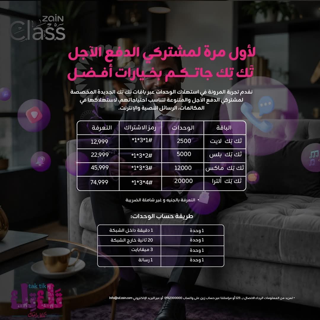 لأول مرة، تقدم زين السودان خيارات متميزة لمشتركي الدفع الآجل عبر باقات تك تك الجديدة، التي توفر مرونة في استهلاك الوحدات للمكالمات، الرسائل النصية، والإنترنت. تم تصميم الباقات المتنوعة لتناسب احتياجات المستخدمين وتقديم تجربة أفضل.