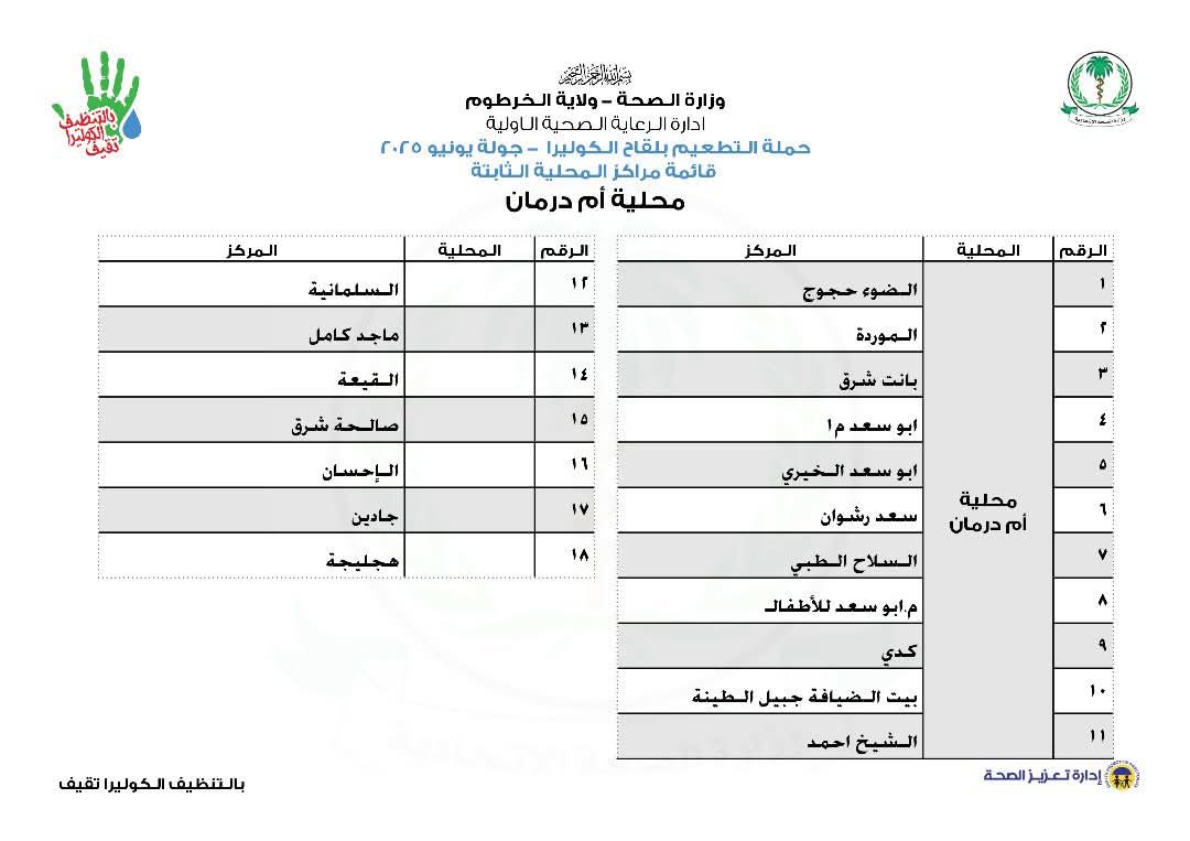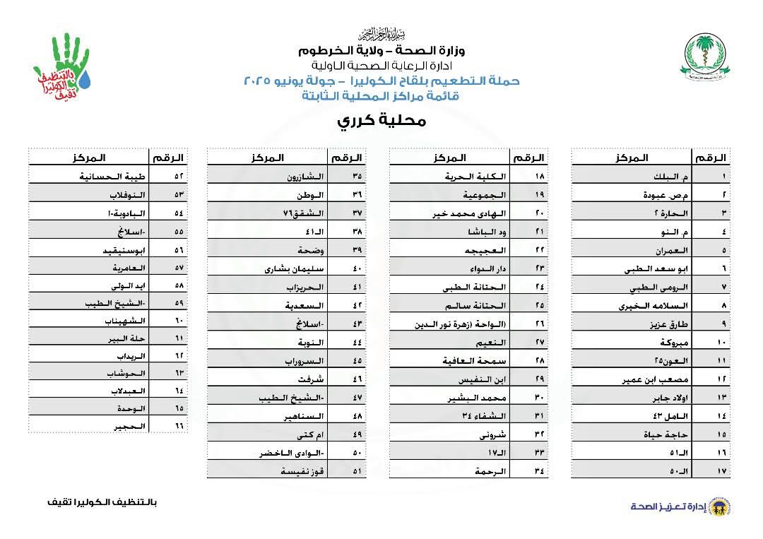 متابعات _ الأحداث نيوز _ في إطار الجهود المبذولة للحد من انتشار مرض الكوليرا، أطلقت الجهات الصحية بولاية الخرطوم حملة توعوية تحثّ المواطنين على اتباع السلوكيات الصحية السليمة، إلى جانب دعوة لتلقي لقاح الكوليرا عبر المراكز المعتمدة في الولاية.