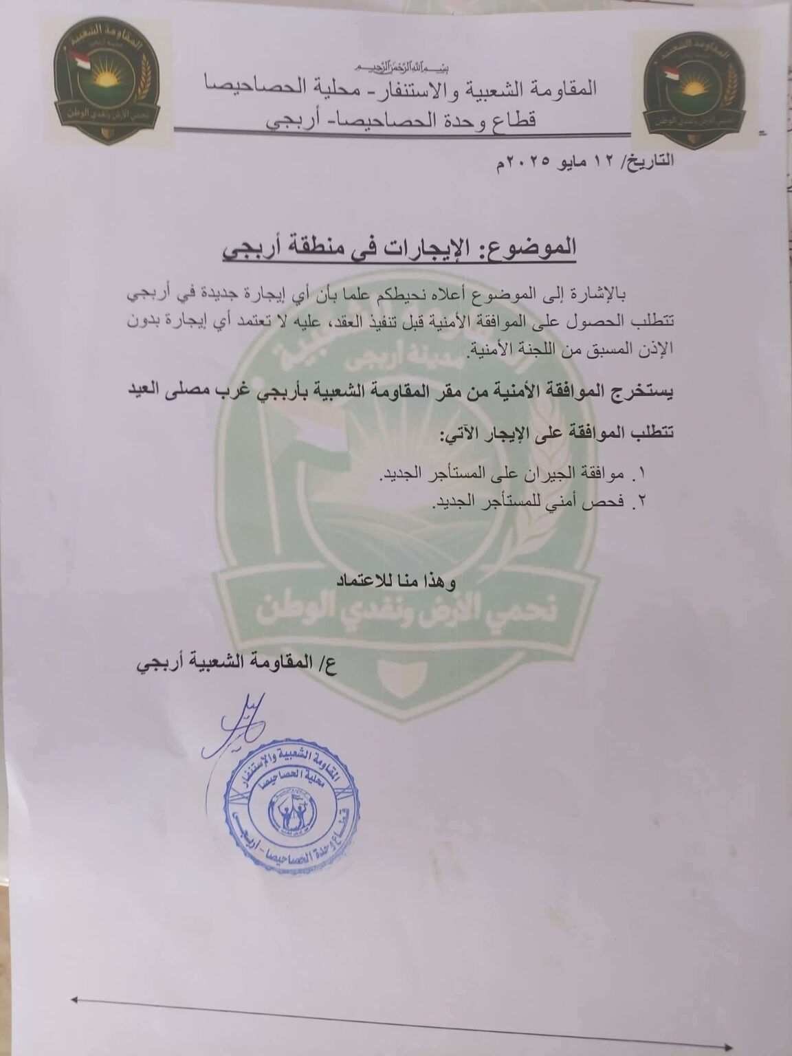 متابعات _ الأحداث نيوز _ في خطوة أثرت على السوق العقاري المحلي، أعلنت المقاومة الشعبية والاستنفار في محلية الحصاحيصا – قطاع ووحدة الحصاحيصا (أربجي)، فرض إجراءات أمنية جديدة صارمة على عمليات الإيجار داخل المنطقة، وفقًا لخطاب رسمي صادر بتاريخ 12 مايو 2025.