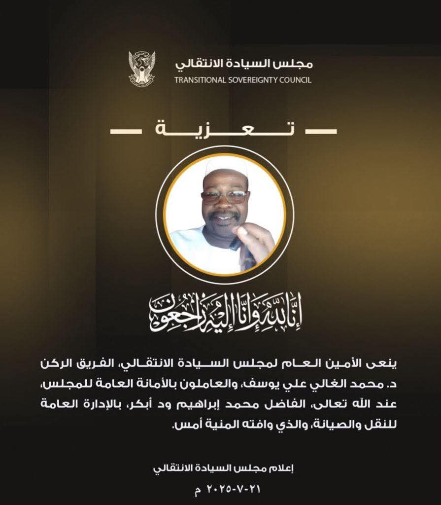 متابعات – الاحداث نيوز – نعت الأمانة العامة لمجلس السيادة الانتقالي، ببالغ الحزن والأسى، المغفور له بإذن الله الفاضل محمد إبراهيم ود أبكر، الموظف بالإدارة العامة للنقل والصيانة، والذي انتقل إلى رحمة الله أمس.