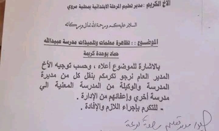 متابعات – الاحداث نيوز – أصدرت إدارة التعليم بالولاية الشمالية قرارًا إداريًا بنقل مديرة مدرسة عبيدالله الأساسية ووكيلتها إلى مدارس أخرى، مع فرض جزاءات إدارية تضمنت حرمان المديرة من تقلّد أي منصب إداري مستقبلاً، وذلك عقب خروج تلاميذ المدرسة في مظاهرة سلمية للمطالبة بعودة التيار الكهربائي، والذي يصل للمدينة 12 يومًا فقط في الشهر، وفقًا لبيانات محلية.