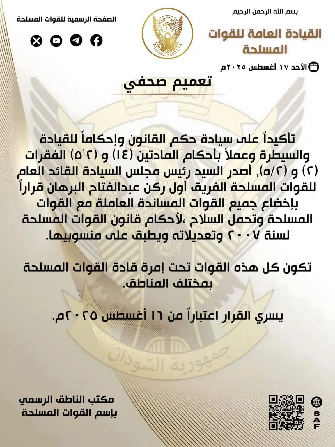 ونص القرار على أن تكون جميع هذه القوات تحت إمرة قادة القوات المسلحة في مختلف المناطق العسكرية، على أن يسري القرار ابتداءً من يوم 16 أغسطس 2025م.
