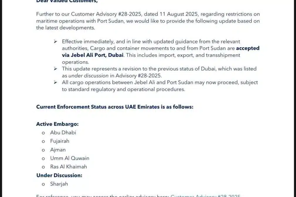 متابعات – الاحداث نيوز – كشفت مصادر ملاحية في موانئ دولة الإمارات عن استئناف عمليات الشحن البحري بين ميناء بورتسودان وميناء جبل علي في دبي، وذلك بعد فترة من التوقف نتيجة التوترات السياسية التي شهدتها العلاقات بين السودان والإمارات.