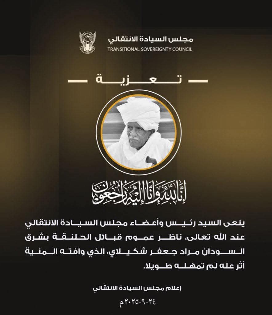 متابعات – الاحداث نيوز – الأحداث نيوز – نعى رئيس وأعضاء مجلس السيادة الانتقالي، ناظر عموم قبائل الحلنقة بشرق السودان، مراد جعفر شكيلاي، الذي انتقل إلى رحمة الله مساء اليوم، إثر وعكة صحية لم تمهله طويلًا.