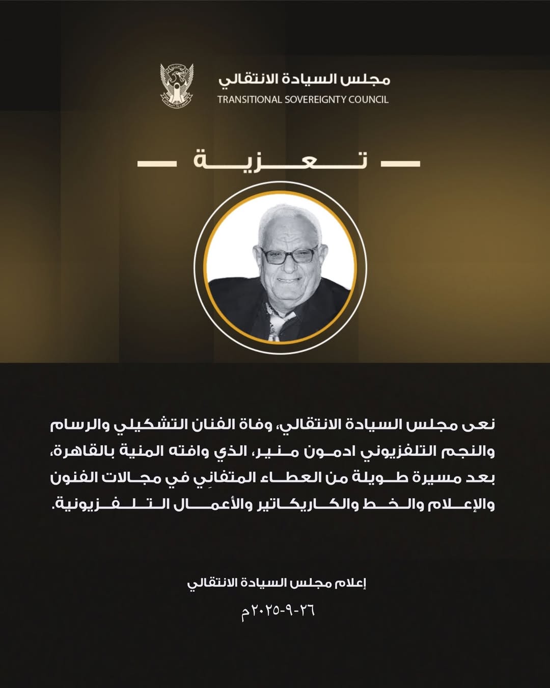 متابعات – الاحداث نيوز – نعى مجلس السيادة الانتقالي وفاة الفنان التشكيلي والرسام والنجم التلفزيوني إدمون منير، الذي وافته المنية في القاهرة، بعد مسيرة حافلة بالعطاء والتفاني في مجالات الفنون والإعلام والخط والكاريكاتير والأعمال التلفزيونية.