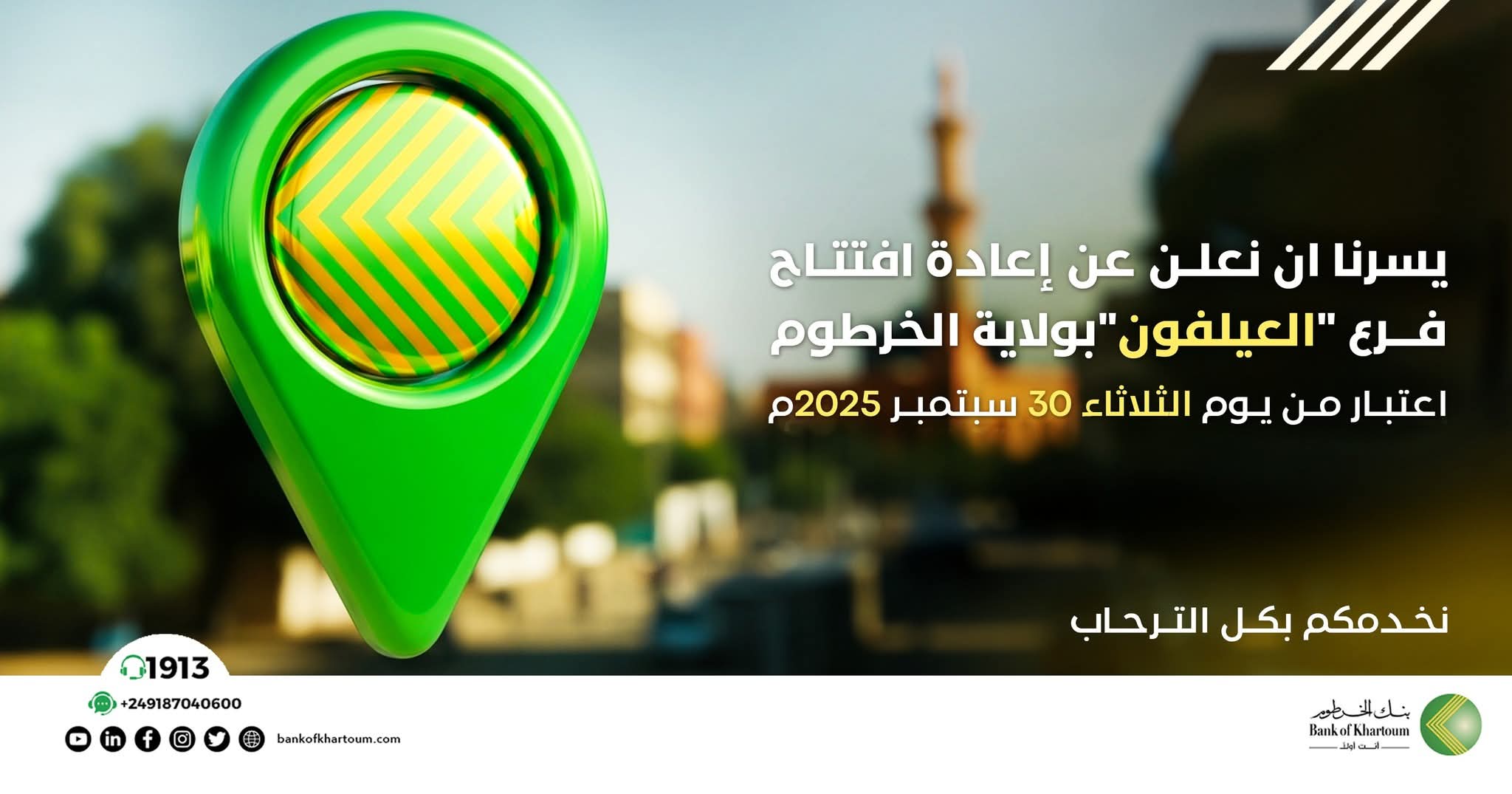 متابعات – الاحداث نيوز – في إطار جهود التعافي واستئناف الخدمات المصرفية في ولاية الخرطوم، أعلن بنك الخرطوم عن إعادة افتتاح فرعيه في منطقتي سوبا شرق والعيلفون، وذلك ابتداءً من يوم الثلاثاء 30 سبتمبر 2025م.