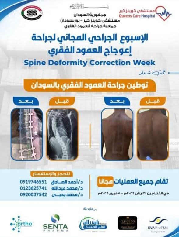 متابعات – الاحداث نيوز – تبدأ غداً السبت في مستشفى كوينز كير ببورتسودان فعاليات الأسبوع الجراحي المجاني المتخصص في علاج اعوجاج العمود الفقري، تحت شعار “توطين جراحة العمود الفقري بالسودان”، والذي تنظمه جمعية جراحة العمود الفقري خلال الفترة من 31 يناير حتى 5 فبراير 2026.