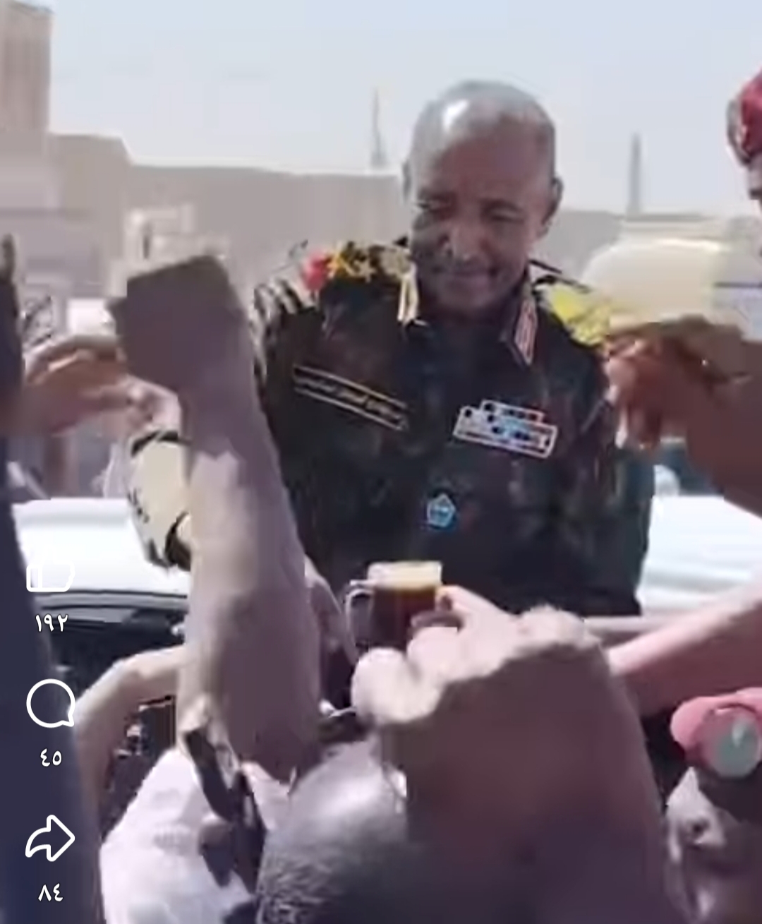 متابعات – الاحداث نيوز – انتشر على منصات التواصل الاجتماعي مقطع فيديو يظهر الفريق أول الركن عبد الفتاح البرهان، رئيس مجلس السيادة والقائد العام للقوات المسلحة، وهو يتناول مشروب العرديب الذي أهداه له أحد المواطنين بالعاصمة الخرطوم.
