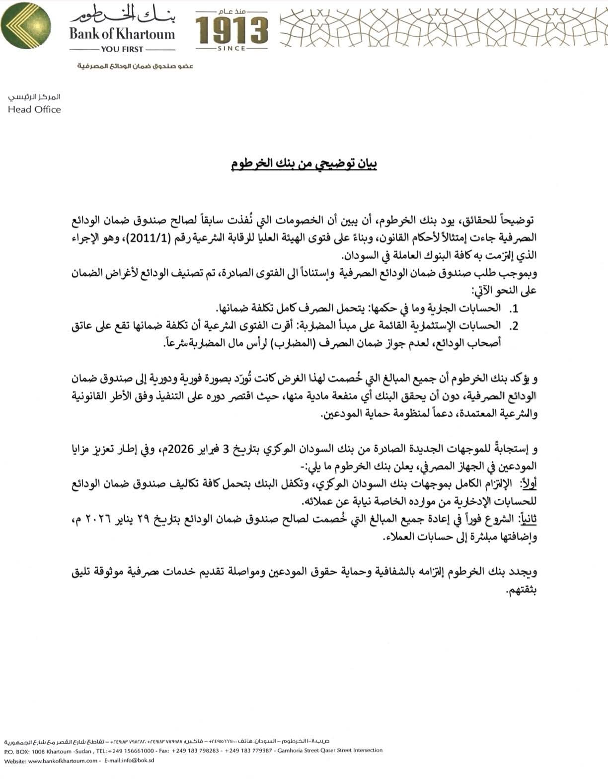 وجدد بنك الخرطوم تأكيده على نهج الشفافية وصون حقوق المودعين، والاستمرار في تقديم خدمات مصرفية موثوقة تعكس ثقة العملاء.