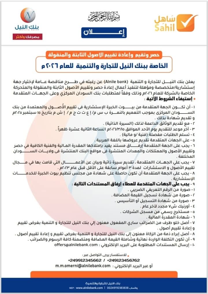 مارس 2026 :بنك النيل للتجارة والتنمية يعلن عن مناقصة لإعادة تقييم الأصول الثابتة والمنقولة