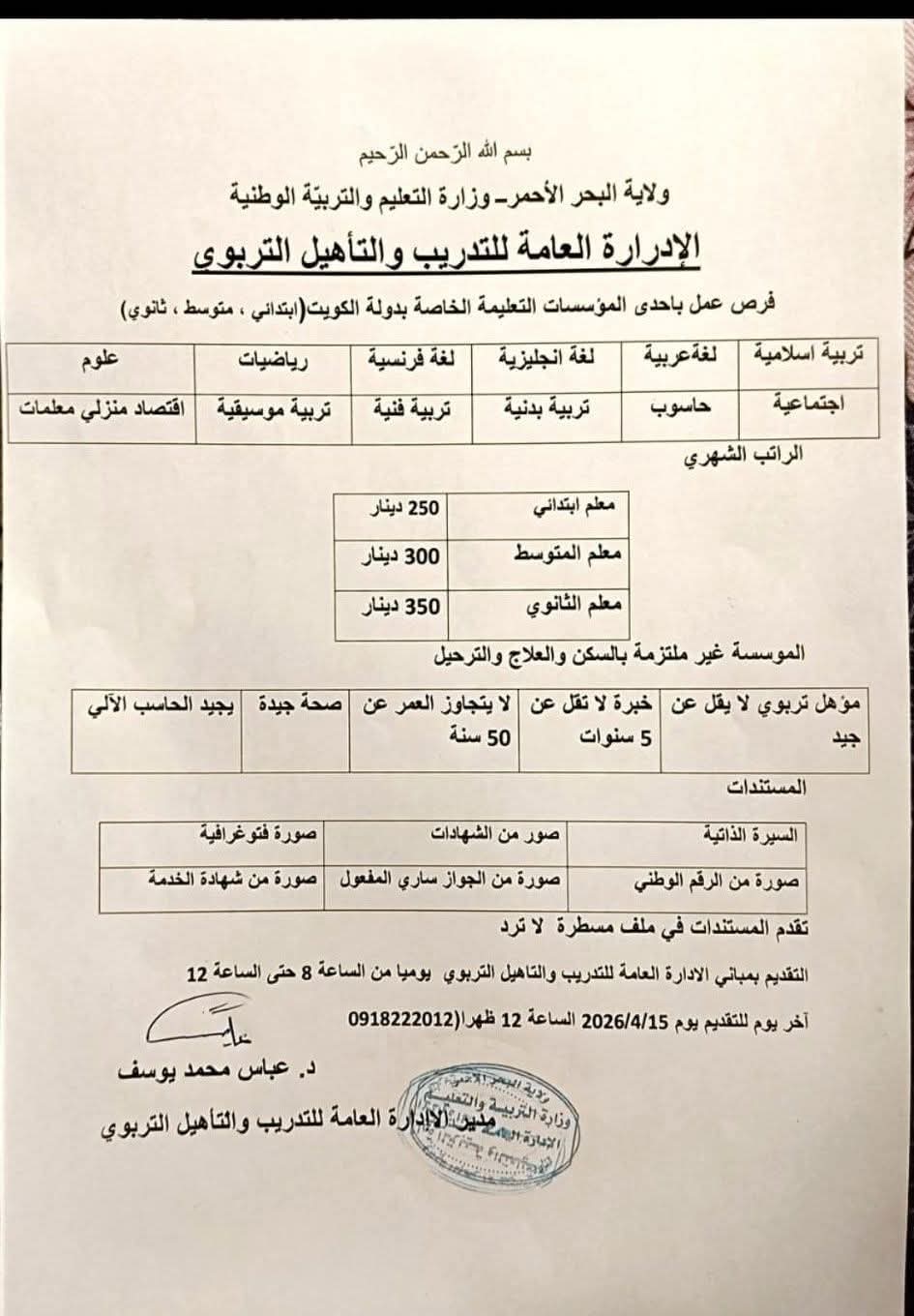 متابعات ـ الأحداث نيوز، أعلنت وزارة التربية والتعليم بولاية البحر الأحمر، عبر الإدارة العامة للتدريب والتأهيل التربوي، فتح باب التقديم لفرص عمل بإحدى المؤسسات التعليمية الخاصة في دولة الكويت، وذلك في إطار جهودها لتوفير فرص خارجية للكوادر التربوية المؤهلة.